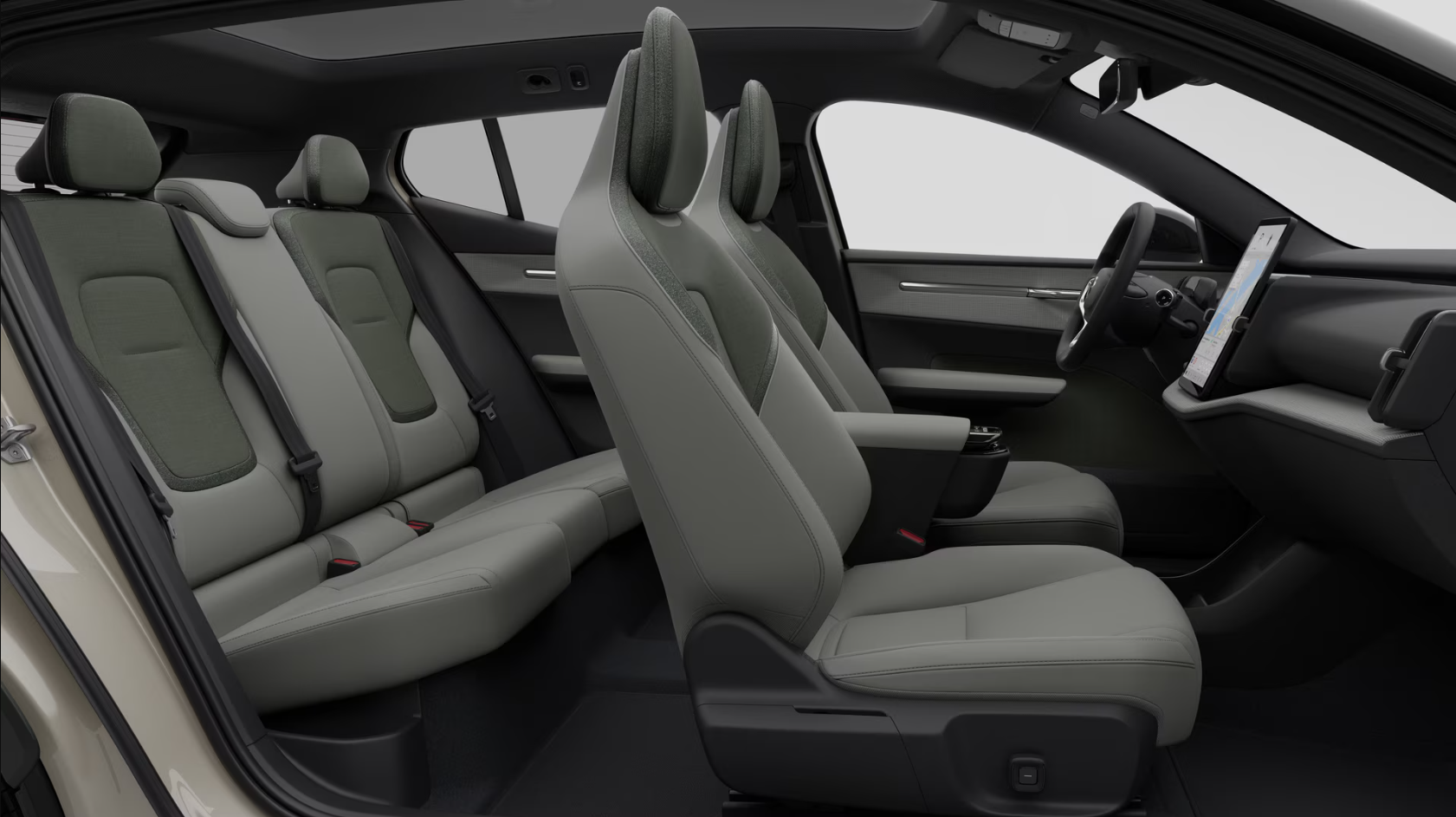 ČALÚNENIE: MIST – PINE – inšpirácia škandinávskymi borovicovými lesmi sivý bio-materiál Nordico / tmavozelený textil z recyklovaného polyesteru a 30% prímesou zodpovedne vyrábanej vlny, dekor z tkaného ľanu – FLAX, priehľadná dekorácia výduchov ventilácie