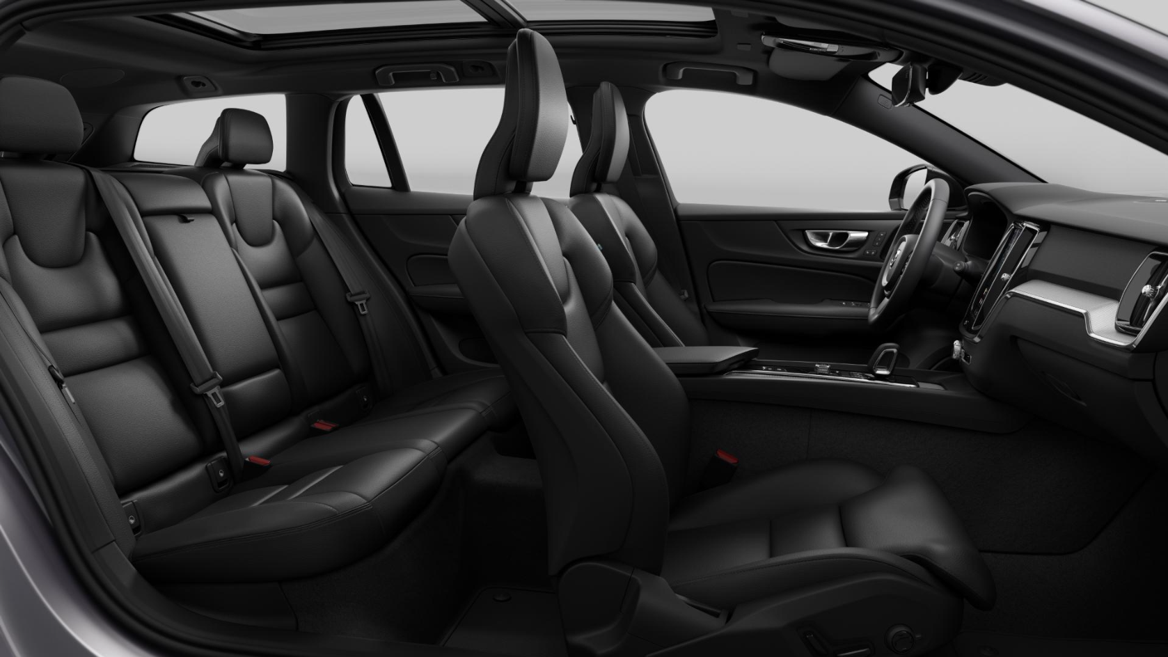 Panoramatické strešné okno, integrovaná elektrická slnečná clona, Kamery parkovacieho asistenta – 360-stupňový pohľad zhora obsahuje predné, zadné a bočné senzory novej generácie, Volvo Guard Alarm s náklonovým a pohybovým čidlom, dvojité uzamykanie zámkov dverí, čierne čalúnenie stropu